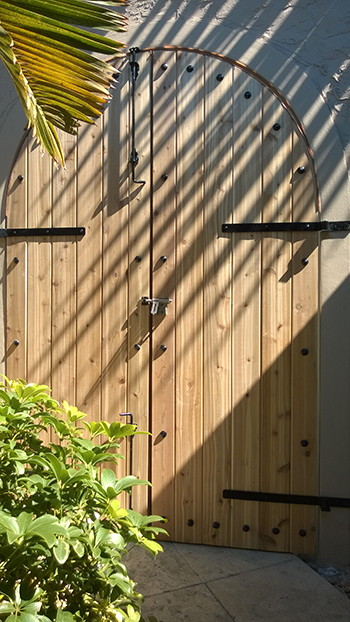 The first of these custom gates leads to the backyard path. The second had been a decorative arch opening to the front entry, but now creates a private courtyard on the way to the front door.
